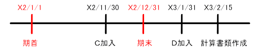 例えば、ある合同会社(事業年度1/1~12/31)の社員がA(出資価額100万円)、B(出資価額100万円)の2名であったが、C(出資価額100万円)がX2年11月30日、D(出資価額100万円)がX3年1月31日に新たに社員になったとします。